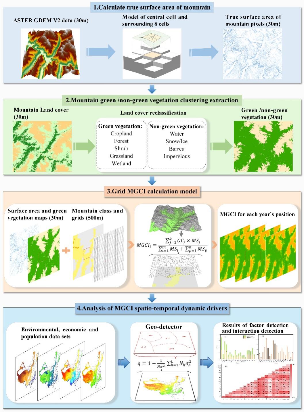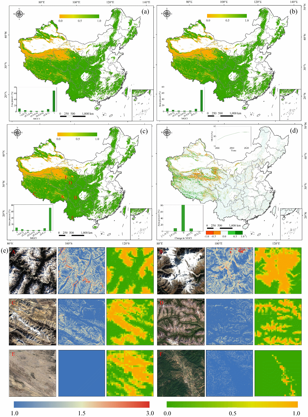 ????团队进一步创新性地构建了首个兼顾山地真实三维曲面特性的SDG15.4.2指标山地绿色覆盖指数(MGCI)估算模型。该模型改变了以往基于平面投影面积计算山地指标的局限,显著提升了评估的准确性。基于此模型,团队综合利用多源卫星遥感产品与地球大数据技术,成功实现了我国2000至2022年共23年间MGCI的长时间序列、高空间分辨率动态监测。监测结果显示,我国MGCI整体呈现稳定向好趋势,从2000年的78.15%提升至2022年的82.23%,年均增长率为0.18%。团队还深入分析了其时空格局演变规律与驱动机制。研究发现,该指标的改善区与极少量的退化区在空间上呈现异质性分布,且其变化与海拔、水热梯度密切相关。这一数据为联合国2030年议程的中期评估提供了重要的中国案例与数据支撑。
